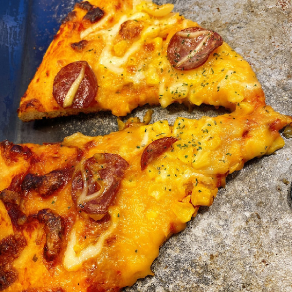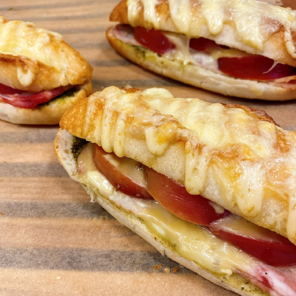 【パニーニ】フランスパンにバジルソース、トマトとベーコンをサンドし、チーズをトッピング!